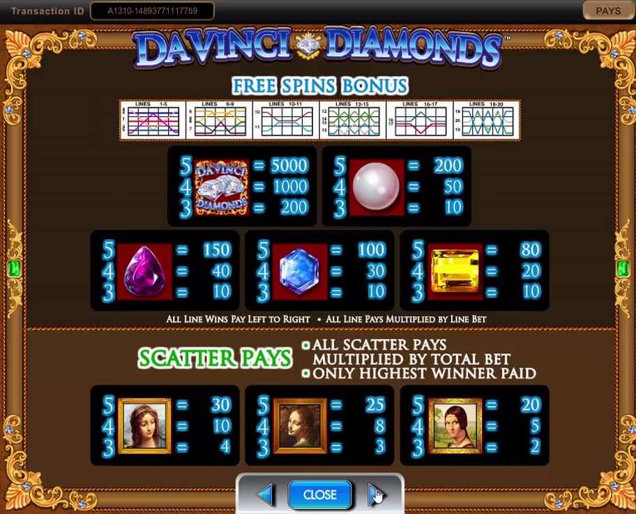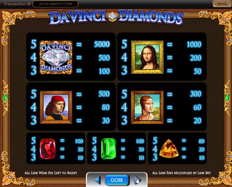 Da Vinci Diamonds es un juego que ha llamado bastante la atención de IGT, la compañía que ofrece dos versiones, la otra tiene la opción de Dual Play. El tema gira en torno a las piedras preciosas, los diamantes y el arte creado por el famoso Leonardo Da Vinci, tal como sugiere el título. Verá que este es un juego con 5 carretes y 20 líneas activas, capaz de entregar pagos que devuelven hasta 5,000 monedas. En el juego, habrá Tumbling Reels para hacer que la acción sea más divertida, junto con símbolos comodín, con dispersiones o giros gratis.